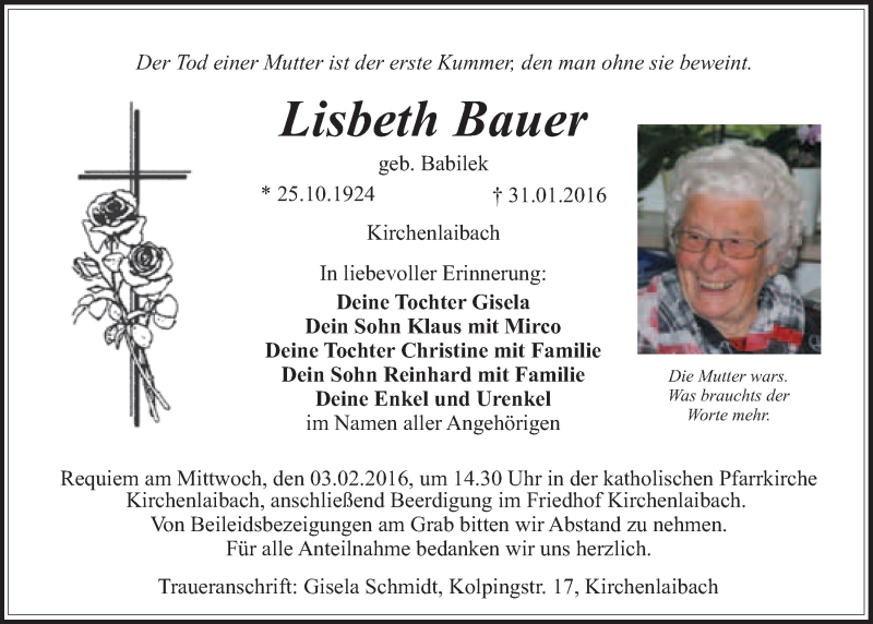 Hier finden Sie alle Traueranzeigen aus der Zeitung, die bisher für Lisbeth Bauer erschienen sind. Weitere Traueranzeigen, die in der Zeitung erscheinen, werden hier ebenfalls aufgelistet