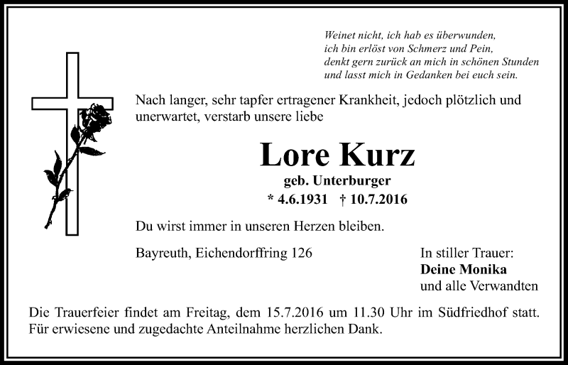 Hier finden Sie alle Traueranzeigen aus der Zeitung, die bisher für Lore Kurz erschienen sind. Weitere Traueranzeigen, die in der Zeitung erscheinen, werden hier ebenfalls aufgelistet
