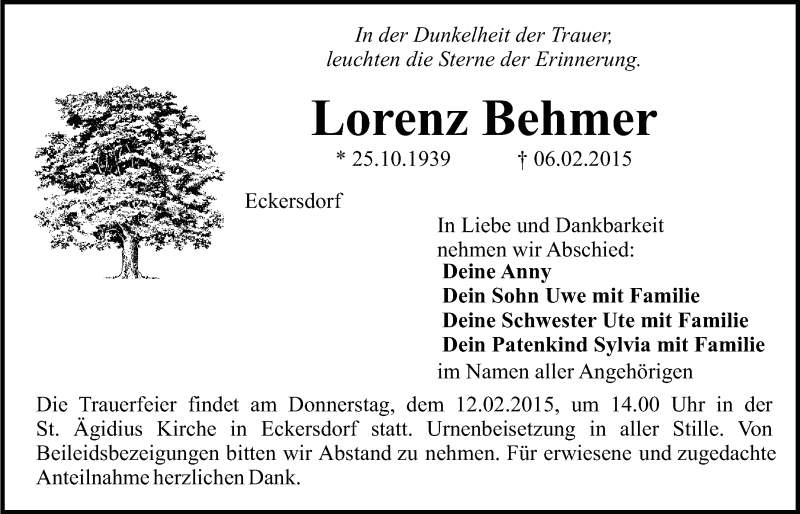 Hier finden Sie alle Traueranzeigen aus der Zeitung, die bisher für Lorenz Behmer erschienen sind. Weitere Traueranzeigen, die in der Zeitung erscheinen, werden hier ebenfalls aufgelistet