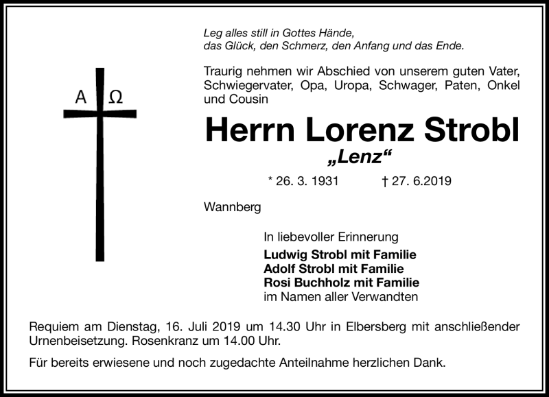 Hier finden Sie alle Traueranzeigen aus der Zeitung, die bisher für Lorenz Strobl erschienen sind. Weitere Traueranzeigen, die in der Zeitung erscheinen, werden hier ebenfalls aufgelistet