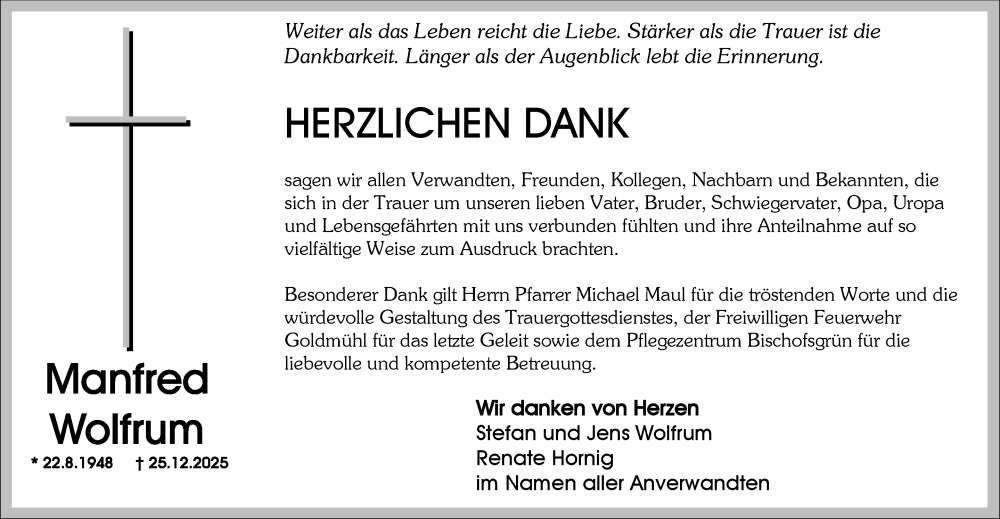 Hier finden Sie alle Traueranzeigen aus der Zeitung, die bisher für Manfred Wolfrum erschienen sind. Weitere Traueranzeigen, die in der Zeitung erscheinen, werden hier ebenfalls aufgelistet