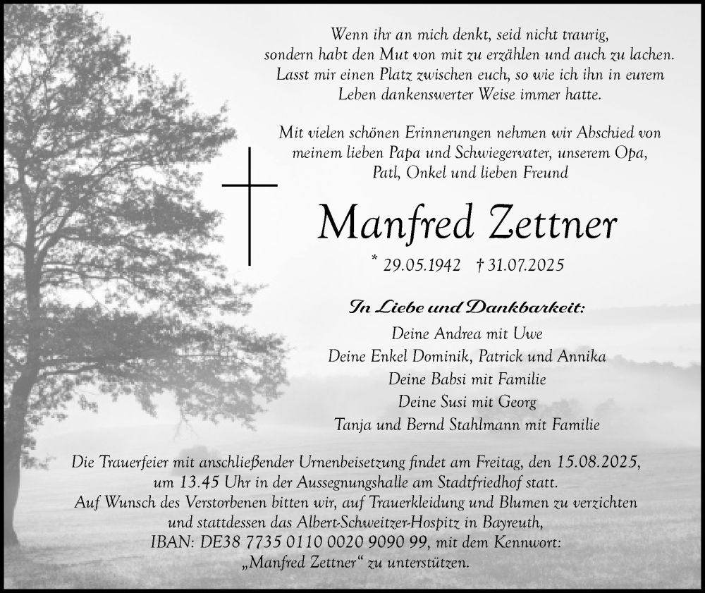 Hier finden Sie alle Traueranzeigen aus der Zeitung, die bisher für Manfred Zettner erschienen sind. Weitere Traueranzeigen, die in der Zeitung erscheinen, werden hier ebenfalls aufgelistet