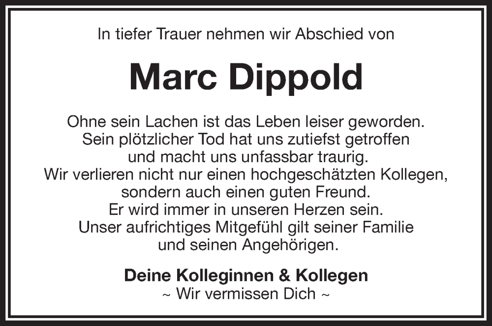 Hier finden Sie alle Traueranzeigen aus der Zeitung, die bisher für Marc Dippold erschienen sind. Weitere Traueranzeigen, die in der Zeitung erscheinen, werden hier ebenfalls aufgelistet