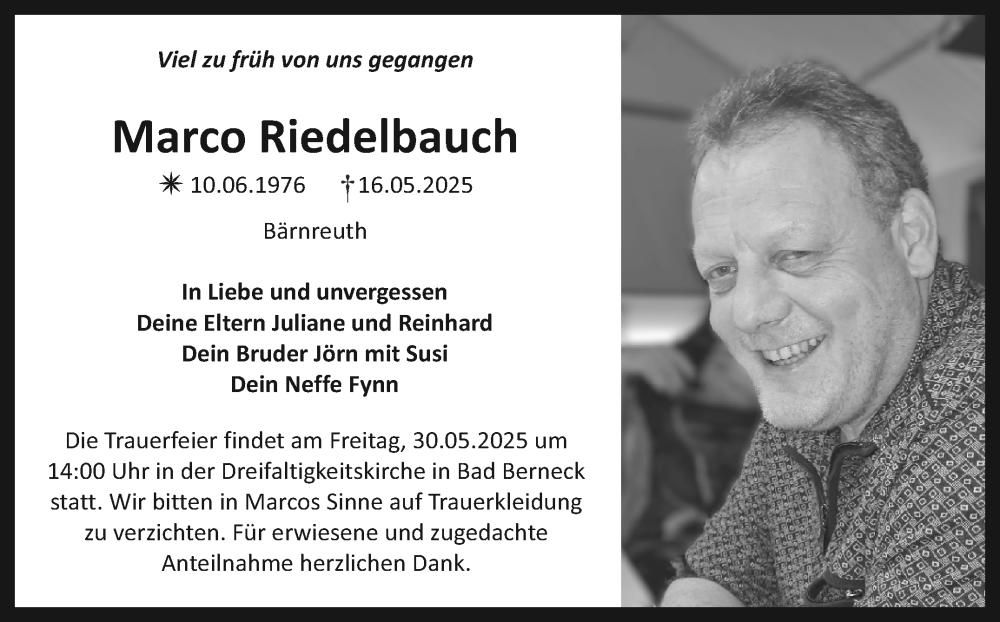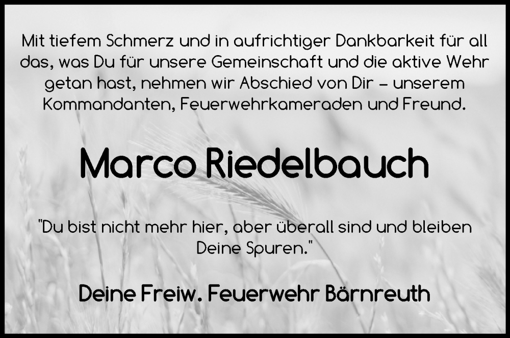 Hier finden Sie alle Traueranzeigen aus der Zeitung, die bisher für Marco Riedelbauch erschienen sind. Weitere Traueranzeigen, die in der Zeitung erscheinen, werden hier ebenfalls aufgelistet