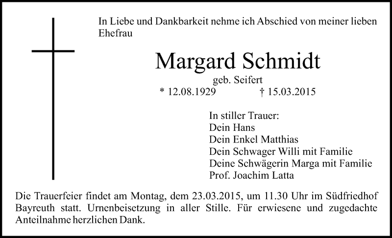 Hier finden Sie alle Traueranzeigen aus der Zeitung, die bisher für Margard Schmidt erschienen sind. Weitere Traueranzeigen, die in der Zeitung erscheinen, werden hier ebenfalls aufgelistet