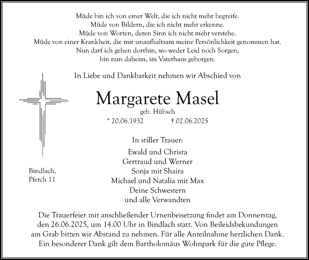Hier finden Sie alle Traueranzeigen aus der Zeitung, die bisher für Margarete Masel erschienen sind. Weitere Traueranzeigen, die in der Zeitung erscheinen, werden hier ebenfalls aufgelistet