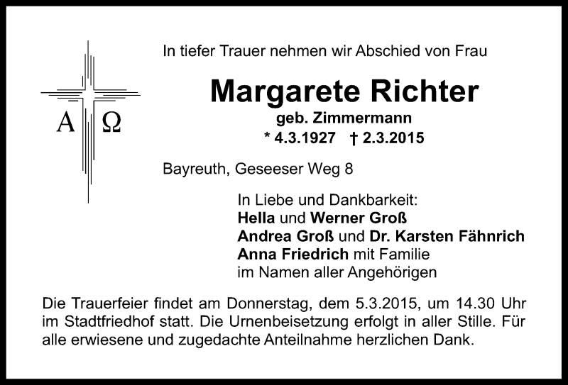 Hier finden Sie alle Traueranzeigen aus der Zeitung, die bisher für Margarete Richter erschienen sind. Weitere Traueranzeigen, die in der Zeitung erscheinen, werden hier ebenfalls aufgelistet