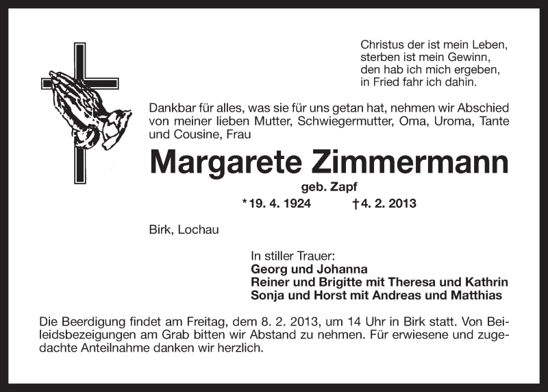 Hier finden Sie alle Traueranzeigen aus der Zeitung, die bisher für Margarete Zimmermann erschienen sind. Weitere Traueranzeigen, die in der Zeitung erscheinen, werden hier ebenfalls aufgelistet