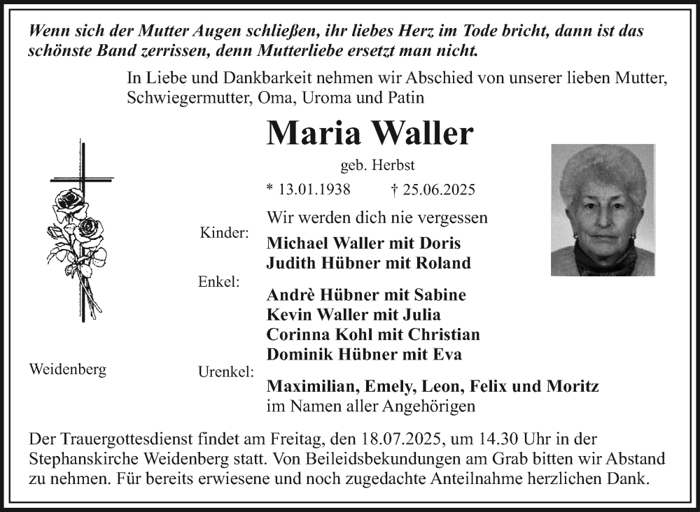 Hier finden Sie alle Traueranzeigen aus der Zeitung, die bisher für Maria Waller erschienen sind. Weitere Traueranzeigen, die in der Zeitung erscheinen, werden hier ebenfalls aufgelistet
