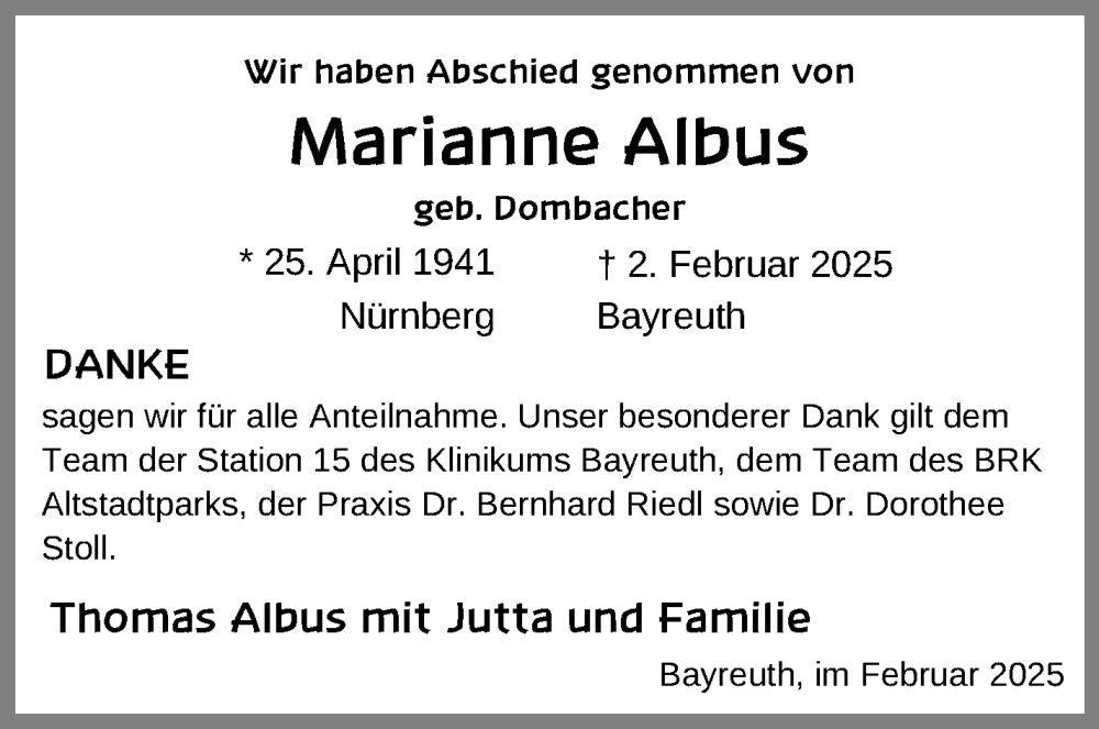 Hier finden Sie alle Traueranzeigen aus der Zeitung, die bisher für Marianne Albus erschienen sind. Weitere Traueranzeigen, die in der Zeitung erscheinen, werden hier ebenfalls aufgelistet