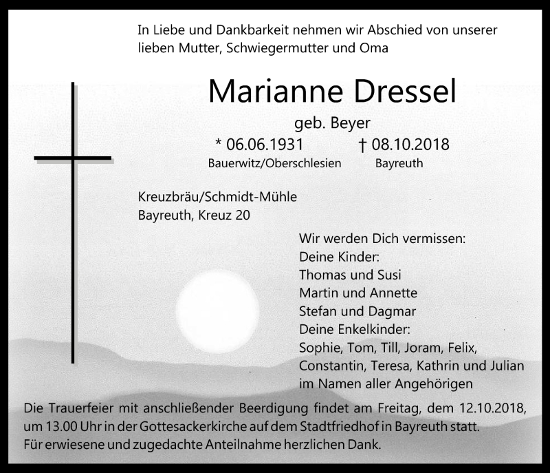 Hier finden Sie alle Traueranzeigen aus der Zeitung, die bisher für Marianne Dressel erschienen sind. Weitere Traueranzeigen, die in der Zeitung erscheinen, werden hier ebenfalls aufgelistet