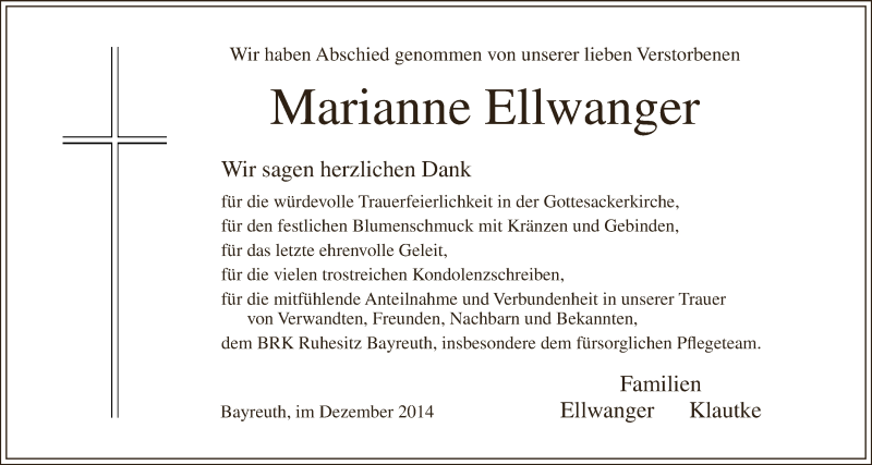 Hier finden Sie alle Traueranzeigen aus der Zeitung, die bisher für Marianne Ellwanger erschienen sind. Weitere Traueranzeigen, die in der Zeitung erscheinen, werden hier ebenfalls aufgelistet