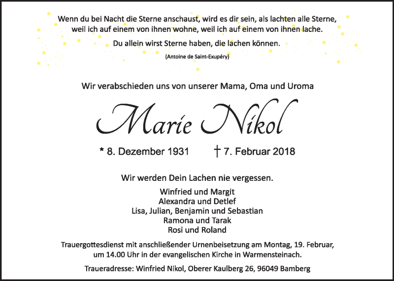 Hier finden Sie alle Traueranzeigen aus der Zeitung, die bisher für Marie Nikol erschienen sind. Weitere Traueranzeigen, die in der Zeitung erscheinen, werden hier ebenfalls aufgelistet