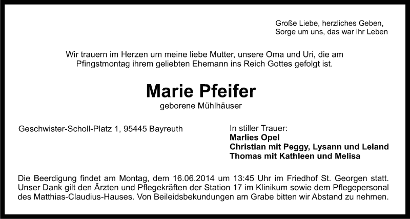 Hier finden Sie alle Traueranzeigen aus der Zeitung, die bisher für Marie Pfeifer erschienen sind. Weitere Traueranzeigen, die in der Zeitung erscheinen, werden hier ebenfalls aufgelistet