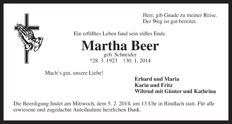 Hier finden Sie alle Traueranzeigen aus der Zeitung, die bisher für Martha Beer erschienen sind. Weitere Traueranzeigen, die in der Zeitung erscheinen, werden hier ebenfalls aufgelistet