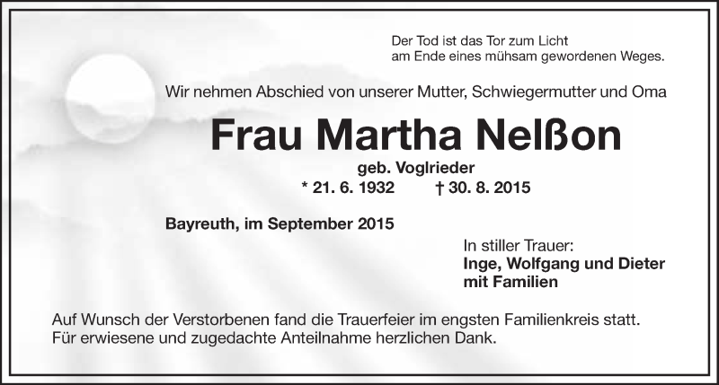 Hier finden Sie alle Traueranzeigen aus der Zeitung, die bisher für Martha Nelßon erschienen sind. Weitere Traueranzeigen, die in der Zeitung erscheinen, werden hier ebenfalls aufgelistet