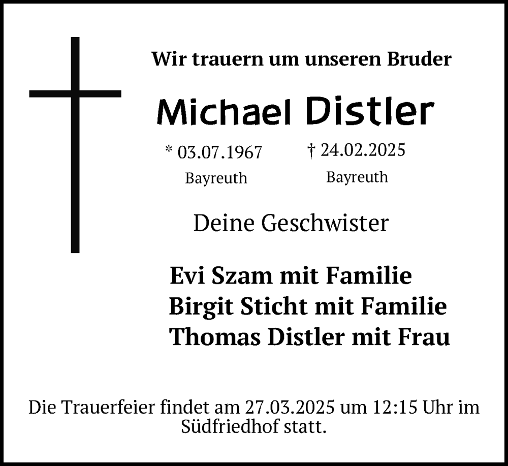 Hier finden Sie alle Traueranzeigen aus der Zeitung, die bisher für Michael Distler erschienen sind. Weitere Traueranzeigen, die in der Zeitung erscheinen, werden hier ebenfalls aufgelistet