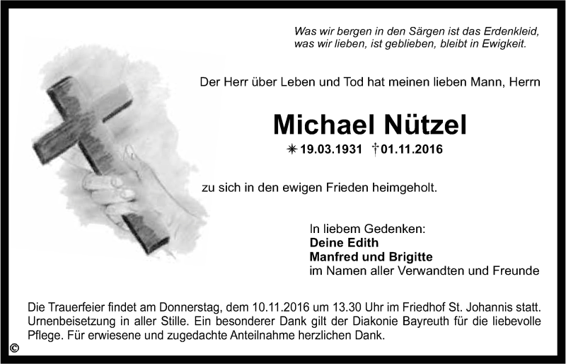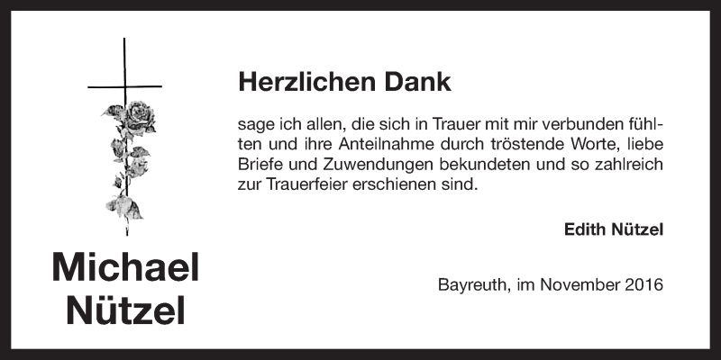 Hier finden Sie alle Traueranzeigen aus der Zeitung, die bisher für Michael Nützel erschienen sind. Weitere Traueranzeigen, die in der Zeitung erscheinen, werden hier ebenfalls aufgelistet