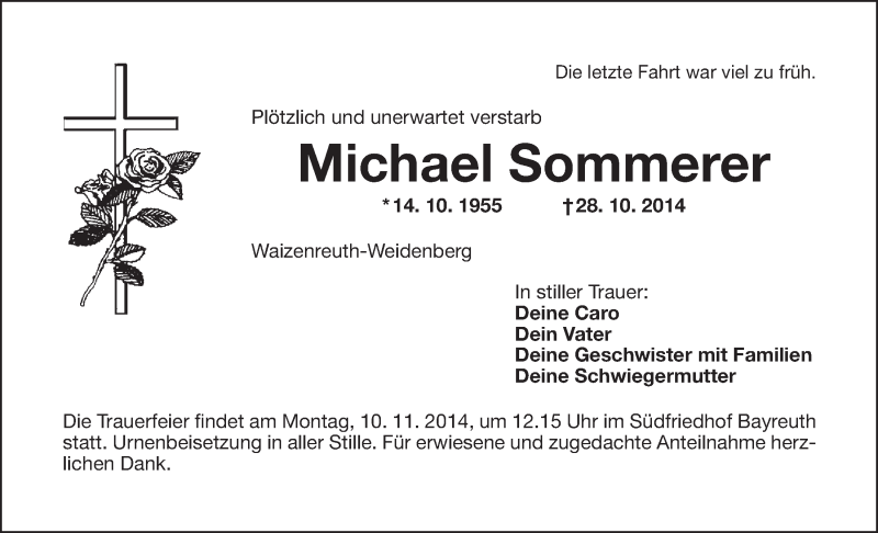 Hier finden Sie alle Traueranzeigen aus der Zeitung, die bisher für Michael Sommerer erschienen sind. Weitere Traueranzeigen, die in der Zeitung erscheinen, werden hier ebenfalls aufgelistet