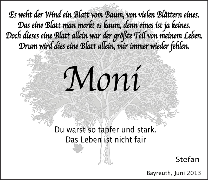 Hier finden Sie alle Traueranzeigen aus der Zeitung, die bisher für Monika Förstl erschienen sind. Weitere Traueranzeigen, die in der Zeitung erscheinen, werden hier ebenfalls aufgelistet