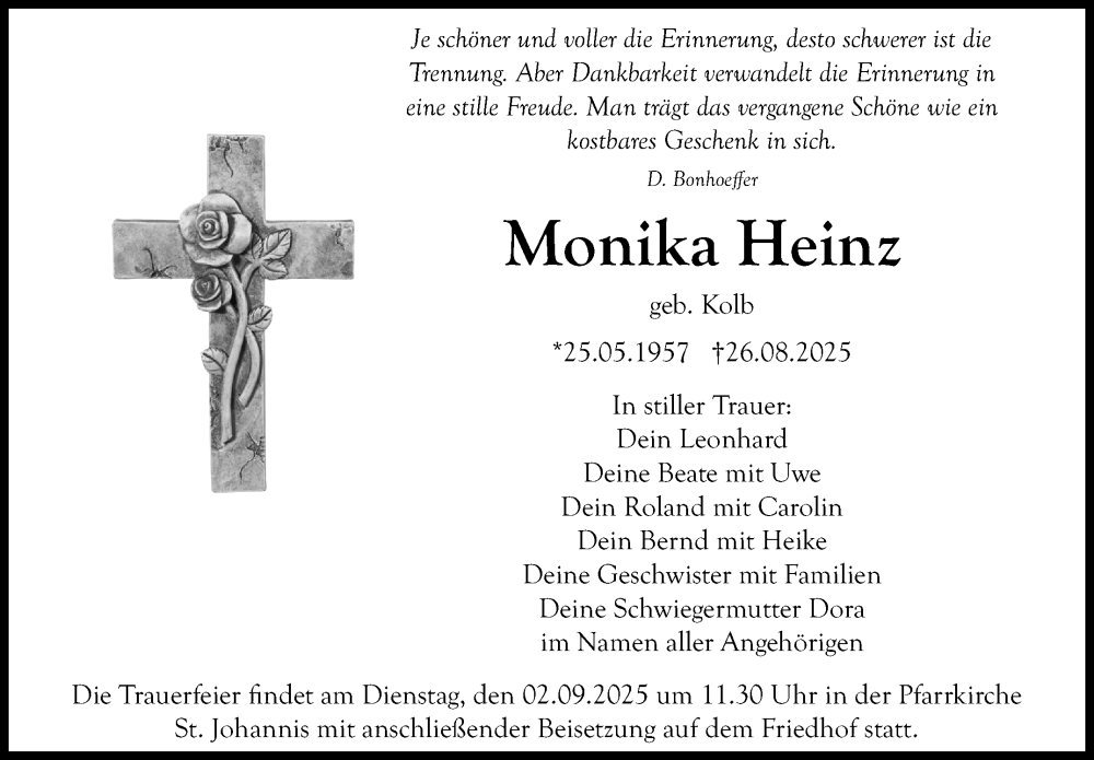 Hier finden Sie alle Traueranzeigen aus der Zeitung, die bisher für Monika Heinz erschienen sind. Weitere Traueranzeigen, die in der Zeitung erscheinen, werden hier ebenfalls aufgelistet