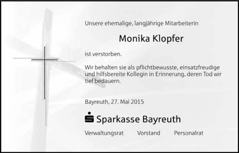 Hier finden Sie alle Traueranzeigen aus der Zeitung, die bisher für Monika Klopfer erschienen sind. Weitere Traueranzeigen, die in der Zeitung erscheinen, werden hier ebenfalls aufgelistet