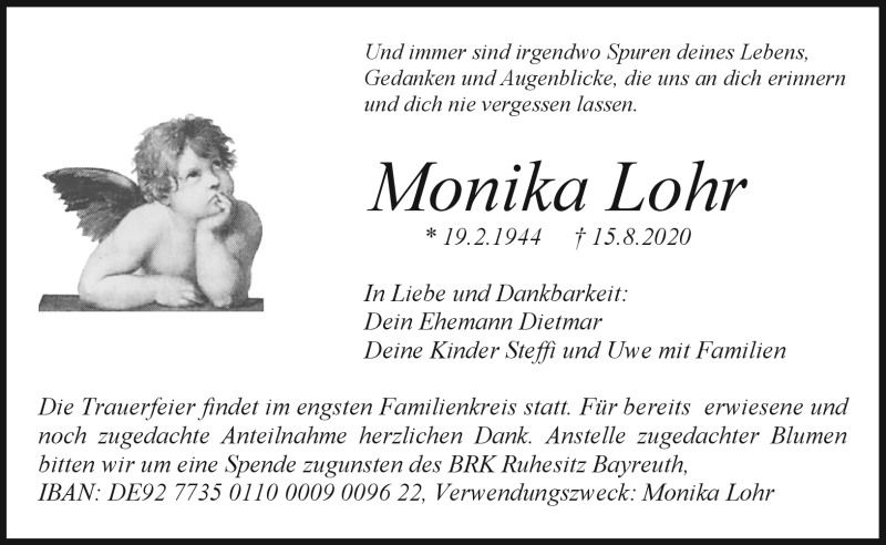 Hier finden Sie alle Traueranzeigen aus der Zeitung, die bisher für Monika Lohr erschienen sind. Weitere Traueranzeigen, die in der Zeitung erscheinen, werden hier ebenfalls aufgelistet