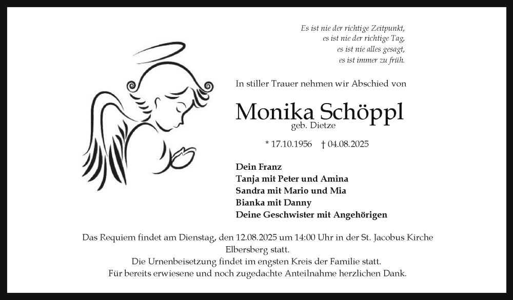 Hier finden Sie alle Traueranzeigen aus der Zeitung, die bisher für Monika Schöppl erschienen sind. Weitere Traueranzeigen, die in der Zeitung erscheinen, werden hier ebenfalls aufgelistet