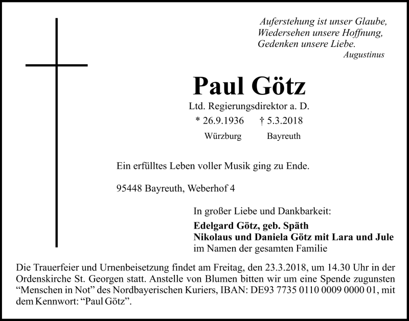 Hier finden Sie alle Traueranzeigen aus der Zeitung, die bisher für Paul Götz erschienen sind. Weitere Traueranzeigen, die in der Zeitung erscheinen, werden hier ebenfalls aufgelistet
