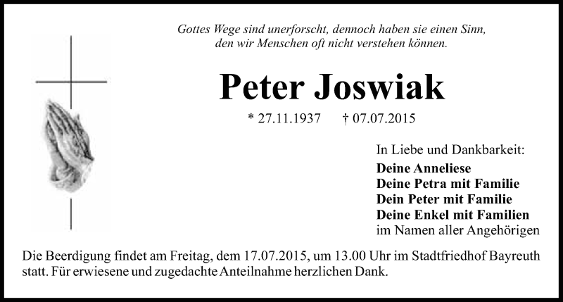 Hier finden Sie alle Traueranzeigen aus der Zeitung, die bisher für Peter Joswiak erschienen sind. Weitere Traueranzeigen, die in der Zeitung erscheinen, werden hier ebenfalls aufgelistet