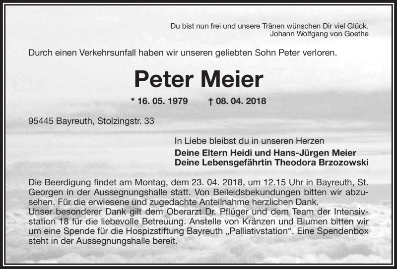 Hier finden Sie alle Traueranzeigen aus der Zeitung, die bisher für Peter Meier erschienen sind. Weitere Traueranzeigen, die in der Zeitung erscheinen, werden hier ebenfalls aufgelistet