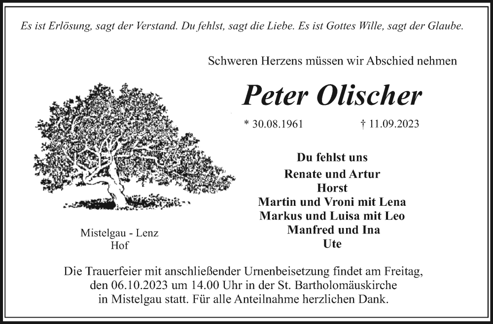 Hier finden Sie alle Traueranzeigen aus der Zeitung, die bisher für Peter Olischer erschienen sind. Weitere Traueranzeigen, die in der Zeitung erscheinen, werden hier ebenfalls aufgelistet