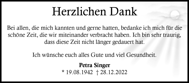 Hier finden Sie alle Traueranzeigen aus der Zeitung, die bisher für Petra Singer erschienen sind. Weitere Traueranzeigen, die in der Zeitung erscheinen, werden hier ebenfalls aufgelistet