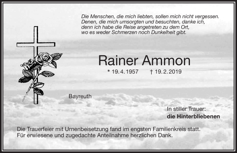 Hier finden Sie alle Traueranzeigen aus der Zeitung, die bisher für Rainer Ammon erschienen sind. Weitere Traueranzeigen, die in der Zeitung erscheinen, werden hier ebenfalls aufgelistet