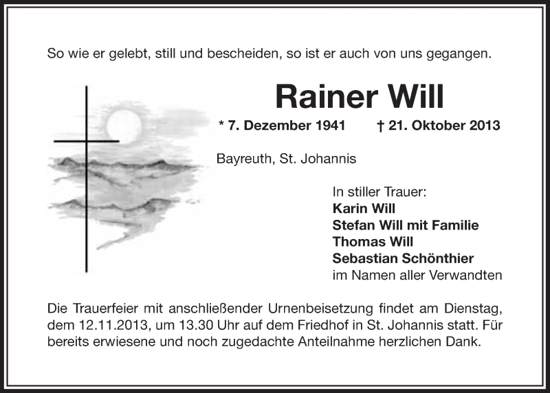 Hier finden Sie alle Traueranzeigen aus der Zeitung, die bisher für Rainer Will erschienen sind. Weitere Traueranzeigen, die in der Zeitung erscheinen, werden hier ebenfalls aufgelistet