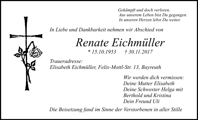 Hier finden Sie alle Traueranzeigen aus der Zeitung, die bisher für Renate Eichmüller erschienen sind. Weitere Traueranzeigen, die in der Zeitung erscheinen, werden hier ebenfalls aufgelistet