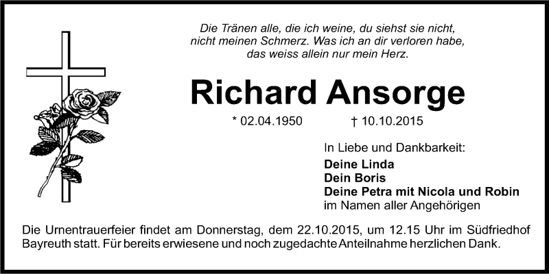 Hier finden Sie alle Traueranzeigen aus der Zeitung, die bisher für Richard Ansorge erschienen sind. Weitere Traueranzeigen, die in der Zeitung erscheinen, werden hier ebenfalls aufgelistet