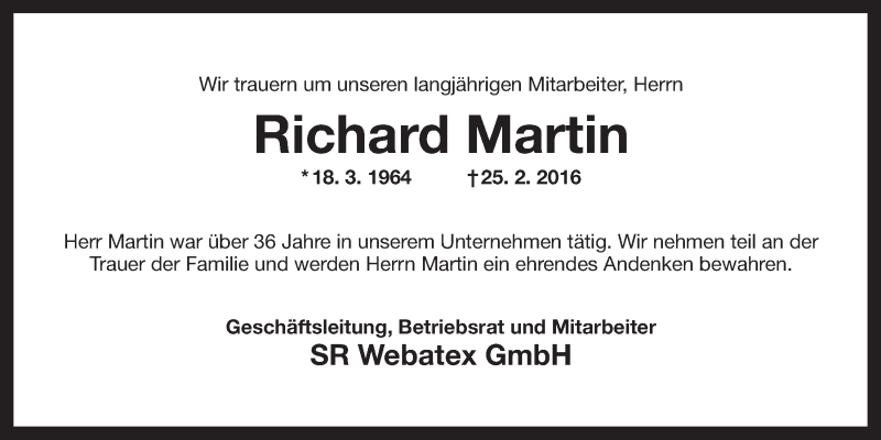 Hier finden Sie alle Traueranzeigen aus der Zeitung, die bisher für Richard Martin erschienen sind. Weitere Traueranzeigen, die in der Zeitung erscheinen, werden hier ebenfalls aufgelistet
