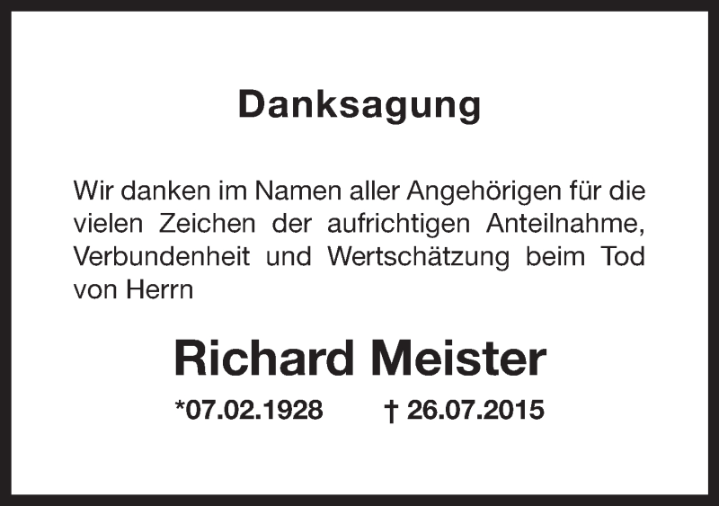 Hier finden Sie alle Traueranzeigen aus der Zeitung, die bisher für Richard Meister erschienen sind. Weitere Traueranzeigen, die in der Zeitung erscheinen, werden hier ebenfalls aufgelistet