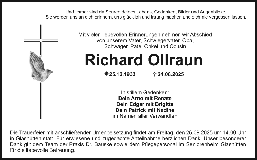 Hier finden Sie alle Traueranzeigen aus der Zeitung, die bisher für Richard Ollraun erschienen sind. Weitere Traueranzeigen, die in der Zeitung erscheinen, werden hier ebenfalls aufgelistet