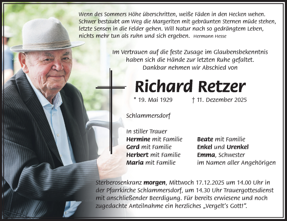 Hier finden Sie alle Traueranzeigen aus der Zeitung, die bisher für Richard Retzer erschienen sind. Weitere Traueranzeigen, die in der Zeitung erscheinen, werden hier ebenfalls aufgelistet