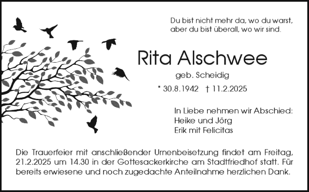 Hier finden Sie alle Traueranzeigen aus der Zeitung, die bisher für Rita Alschwee erschienen sind. Weitere Traueranzeigen, die in der Zeitung erscheinen, werden hier ebenfalls aufgelistet