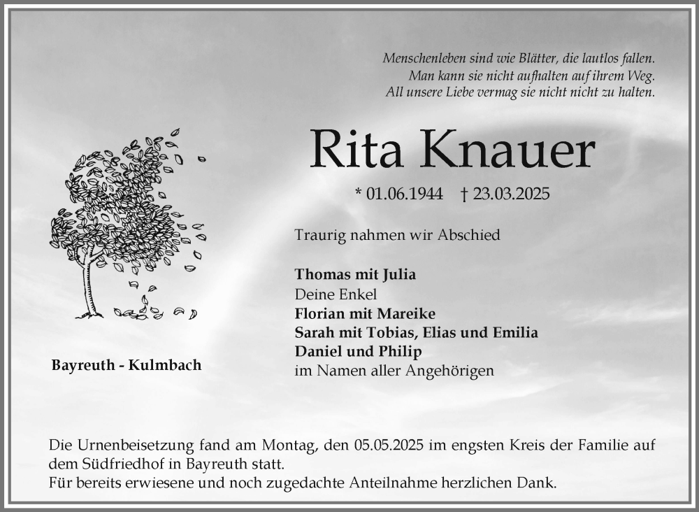 Hier finden Sie alle Traueranzeigen aus der Zeitung, die bisher für Rita Knauer erschienen sind. Weitere Traueranzeigen, die in der Zeitung erscheinen, werden hier ebenfalls aufgelistet