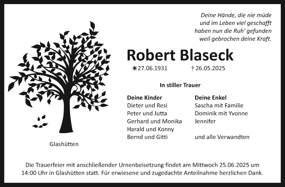 Hier finden Sie alle Traueranzeigen aus der Zeitung, die bisher für Robert Blaseck erschienen sind. Weitere Traueranzeigen, die in der Zeitung erscheinen, werden hier ebenfalls aufgelistet