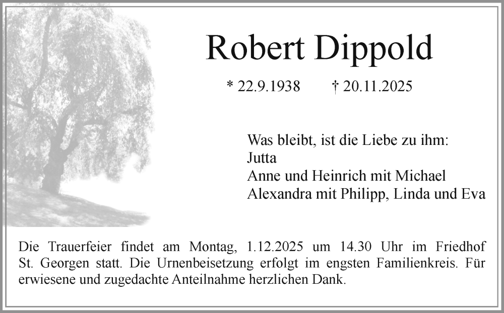 Hier finden Sie alle Traueranzeigen aus der Zeitung, die bisher für Robert Dippold erschienen sind. Weitere Traueranzeigen, die in der Zeitung erscheinen, werden hier ebenfalls aufgelistet