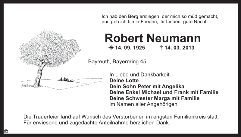 Hier finden Sie alle Traueranzeigen aus der Zeitung, die bisher für Robert Neumann erschienen sind. Weitere Traueranzeigen, die in der Zeitung erscheinen, werden hier ebenfalls aufgelistet