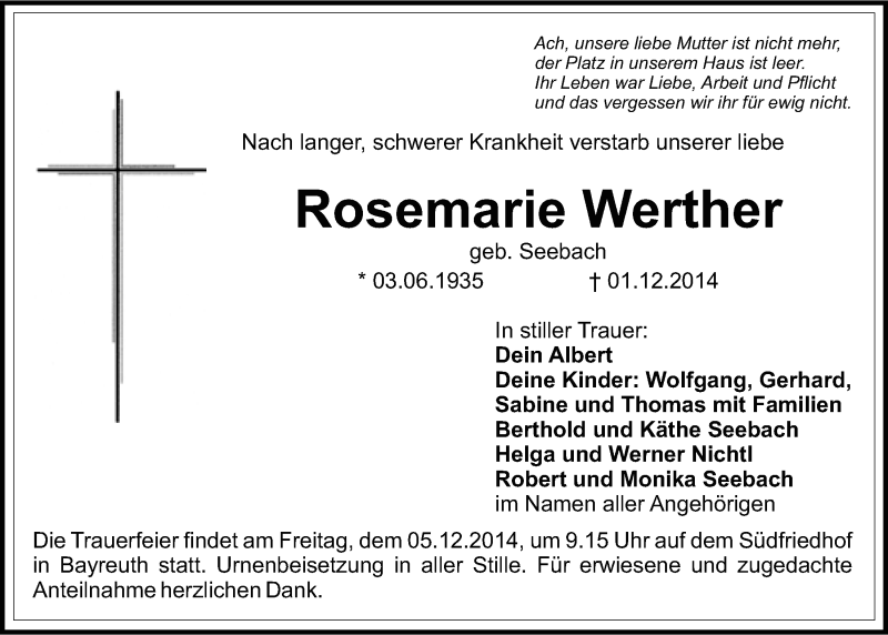 Hier finden Sie alle Traueranzeigen aus der Zeitung, die bisher für Rosemarie Werther erschienen sind. Weitere Traueranzeigen, die in der Zeitung erscheinen, werden hier ebenfalls aufgelistet