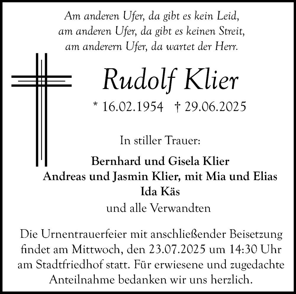 Hier finden Sie alle Traueranzeigen aus der Zeitung, die bisher für Rudolf Klier erschienen sind. Weitere Traueranzeigen, die in der Zeitung erscheinen, werden hier ebenfalls aufgelistet