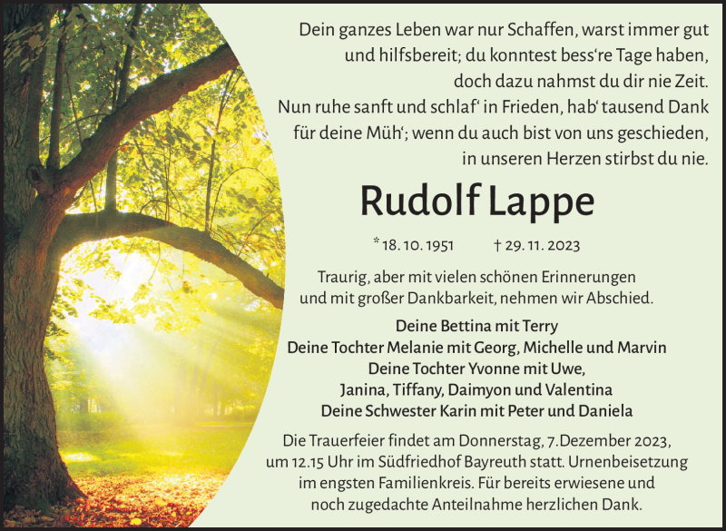 Hier finden Sie alle Traueranzeigen aus der Zeitung, die bisher für Rudolf Lappe erschienen sind. Weitere Traueranzeigen, die in der Zeitung erscheinen, werden hier ebenfalls aufgelistet