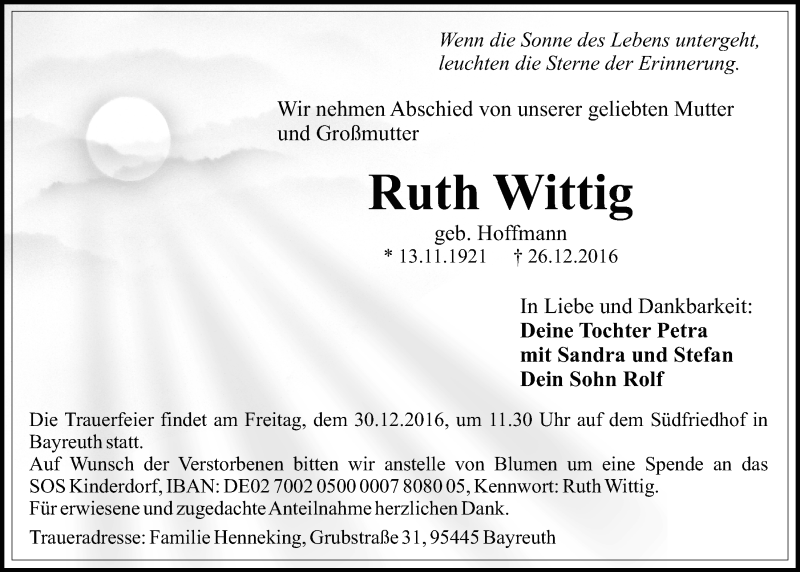 Hier finden Sie alle Traueranzeigen aus der Zeitung, die bisher für Ruth Wittig erschienen sind. Weitere Traueranzeigen, die in der Zeitung erscheinen, werden hier ebenfalls aufgelistet